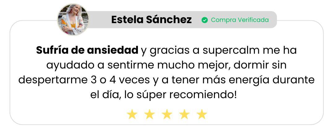 Antes de Supercalm no podía tomar cafeína porque me ponía demasiado nerviosa y ansiosa, lo cual es una lástima porque me encanta el café. ¡Pero ahora puedo tomarlo sin preocuparme porque me tomo un sobre antes de dormir y duermo de maravilla! Antes de Supercalm no podía tomar cafeína porque me ponía demasiado nerviosa y ansiosa, lo cual es una lástima porque... Antes de Supercalm no podía tomar cafeína porque me ponía demasiado nerviosa y ansiosa, lo cual es una lástima porque me encanta el café. ¡Pero ahora puedo tomarlo sin preocuparme porque me tomo un sobre antes de dormir y duermo de maravilla!